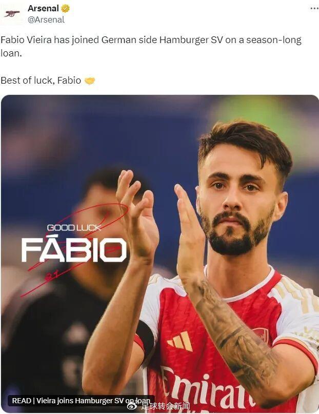 官方:阿森纳宣布维埃拉租借加盟汉堡一个赛季。