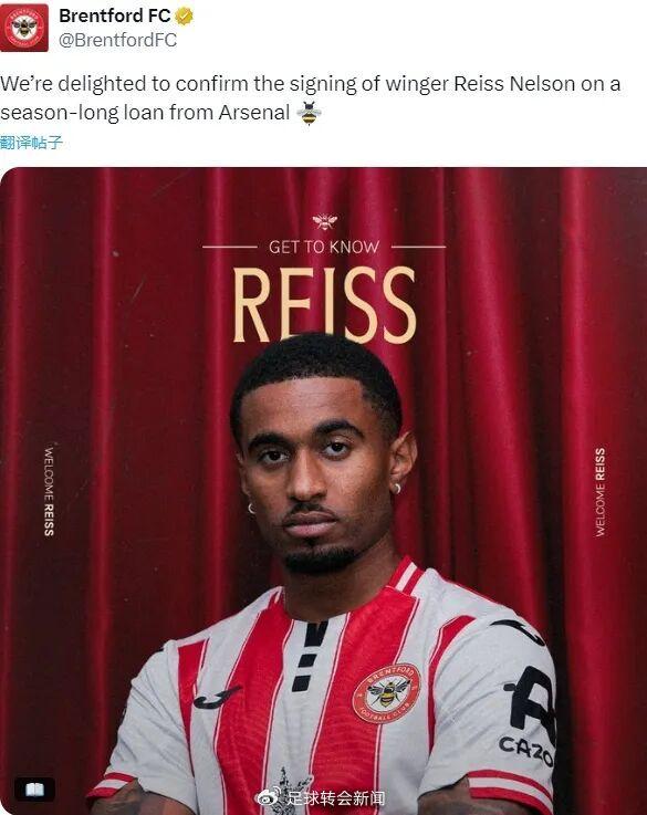 官方:布伦特福德宣布从阿森纳租借签下了内尔森。