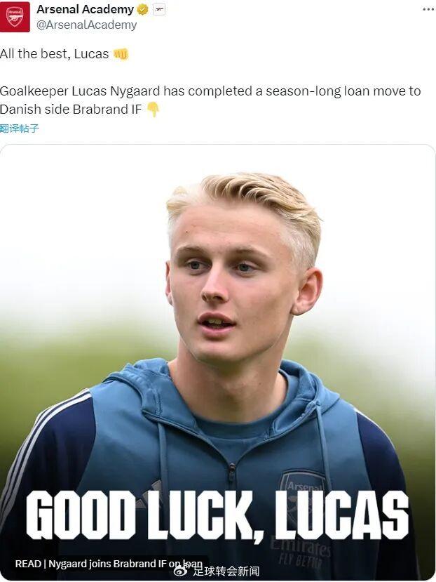 官方:阿森纳宣布卢卡斯-马丁-尼高租借加盟丹麦二级联赛Brabrand IF俱乐部一个赛季。