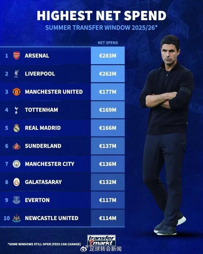 德国转会市场发布了今夏欧洲足坛转会净投入榜单,阿森纳以2.83亿欧元的净投入排在了榜首!
